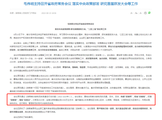 2022年8月15日下午,省長毛偉明主持召開省政府常務會議,研究審議通過了省咨詢公司編制的《湖南省冷鏈物流體系建設行動方案(2022-2025年)》課題,會議指出要結合我省冷鏈物流的流量、流向、流效,構建“設施網(wǎng)”,拓寬“運輸線”,打造“創(chuàng)新鏈”,強化“支撐點”,力爭到2025年,全省冷庫容量達到1500萬立方米,基本建成以長株潭地區(qū)為核心區(qū)塊,以湘南、洞庭湖、大湘西地區(qū)為區(qū)域中心,布局合理、結構優(yōu)化、運行高效、管理規(guī)范的現(xiàn)代冷鏈物流體系