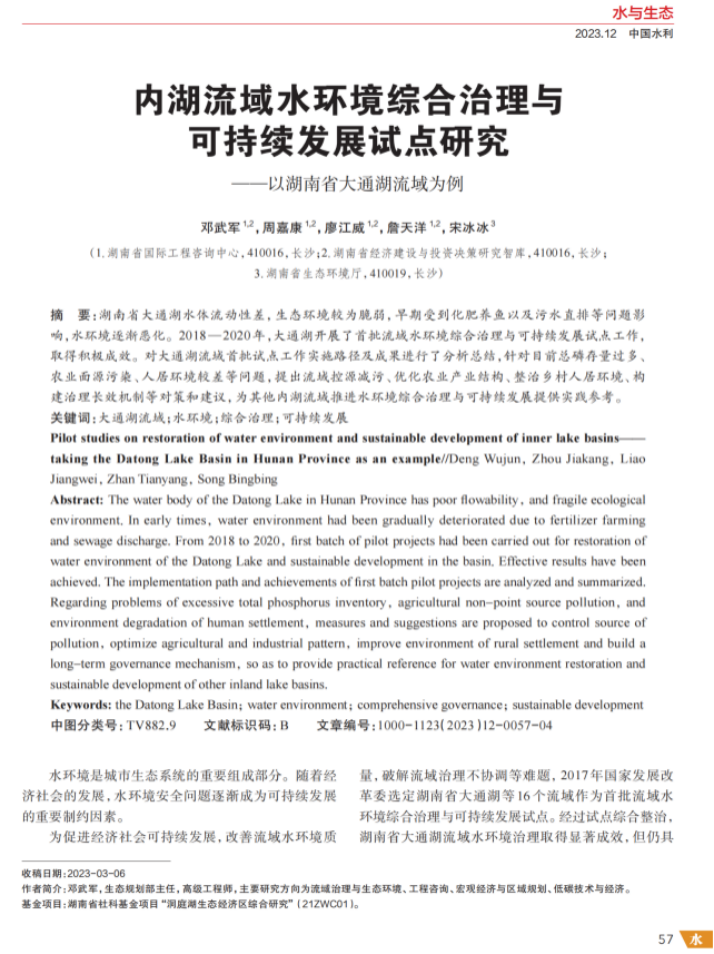 近日,由湘咨集團生態(tài)規(guī)劃咨詢事業(yè)部撰寫的《內(nèi)湖流域水環(huán)境綜合治理與可持續(xù)發(fā)展試點研究—以湖南省大通湖流域為例》一文刊發(fā)于《中國水利》2023年第12期,作者為該部門鄧武軍、周嘉康,廖江威,詹天洋。《中國水利》雜志是水利系統(tǒng)惟一的由水利部主管、主辦的綜合類科技期刊。期刊致力于探討水利發(fā)展對策,交流水利科學(xué)研究新進展、推廣水利新技術(shù)、溝通水利與社會。