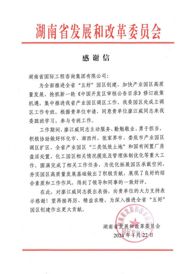 感謝信的背后,飽含著湘咨人專業(yè)敬業(yè)、高效負責(zé)、勇于擔(dān)當(dāng)?shù)闹腔酆推橇Γ仁菍ο孀杉瘓F的充分信賴與認可,更是鼓舞湘咨人踔厲奮發(fā)、勇往直前的強大動力。